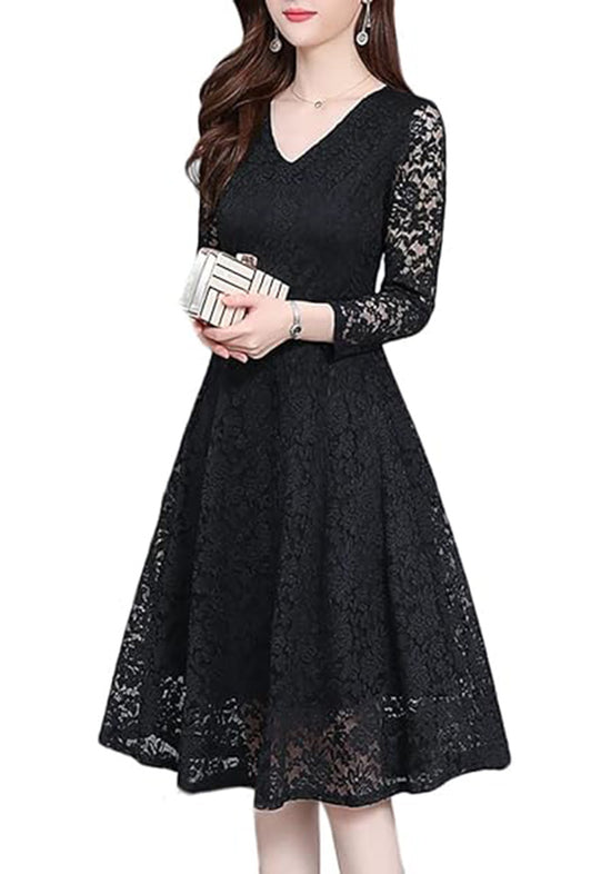 ブラック×ベージュの上品な組み合わせが魅力的なドレス。