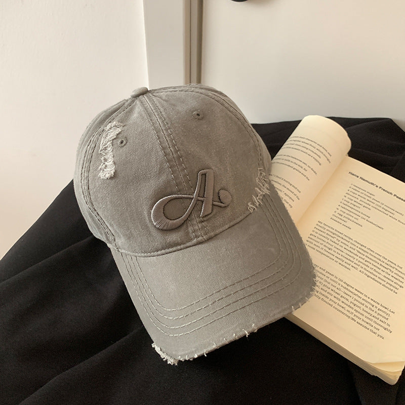顔まわりに抜け感、ウォッシュデニムのダメージキャップ