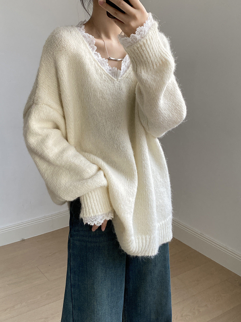 ふんわりと起毛した素材が心地いい、やさしい風合いのVネックニット。広めのネックラインから、レースインナーをちらっとのぞかせれば、ぐっと女の子らしい印象に。袖口からもレースがのぞくから、シンプルだけど華やかに見えるのがうれしいポイント。ゆるっとしたシルエットで体型カバーも叶えて、抜け感のある大人フェミニンスタイルが完成します。パンツにもスカートにも合わせやすく、デイリーに活躍する1着です◎