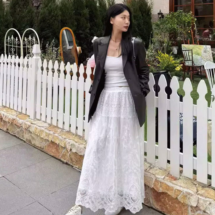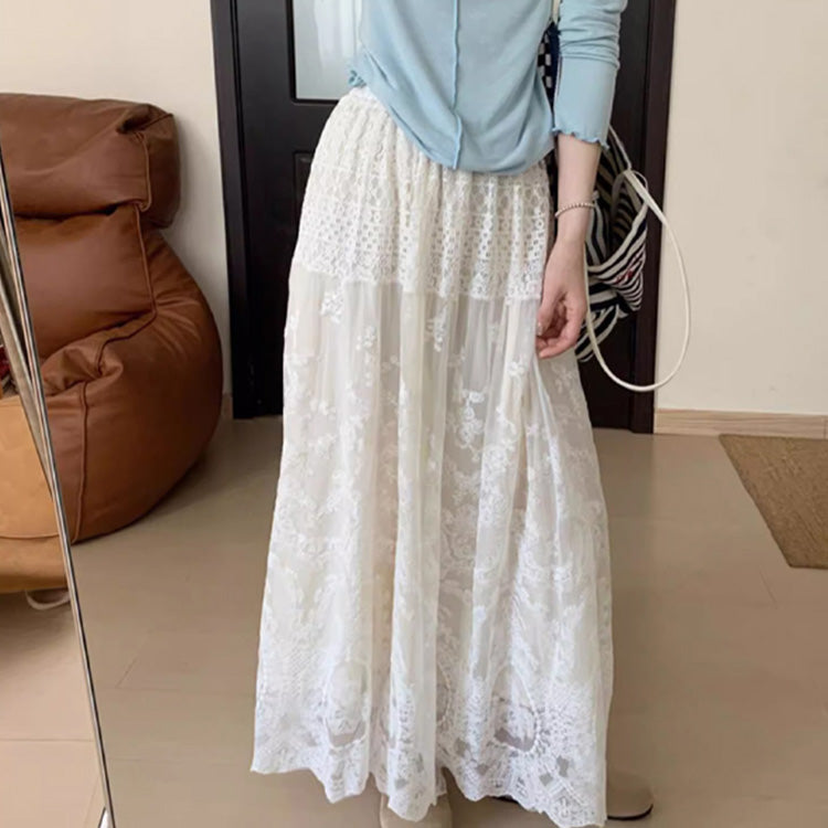 繊細なレースを贅沢に使用した、まるでドレスのような存在感のあるマキシスカート。裾にかけて広がるやわらかなシルエットと刺繍レースの透け感が、甘すぎない大人ガーリーを演出します。ジャケットやブーツでモードに、足元はスニーカーで抜け感をプラスしても◎ トップス次第でシーズンレスに使える、着回し力抜群の一枚です。