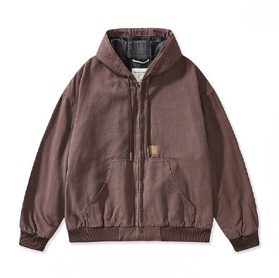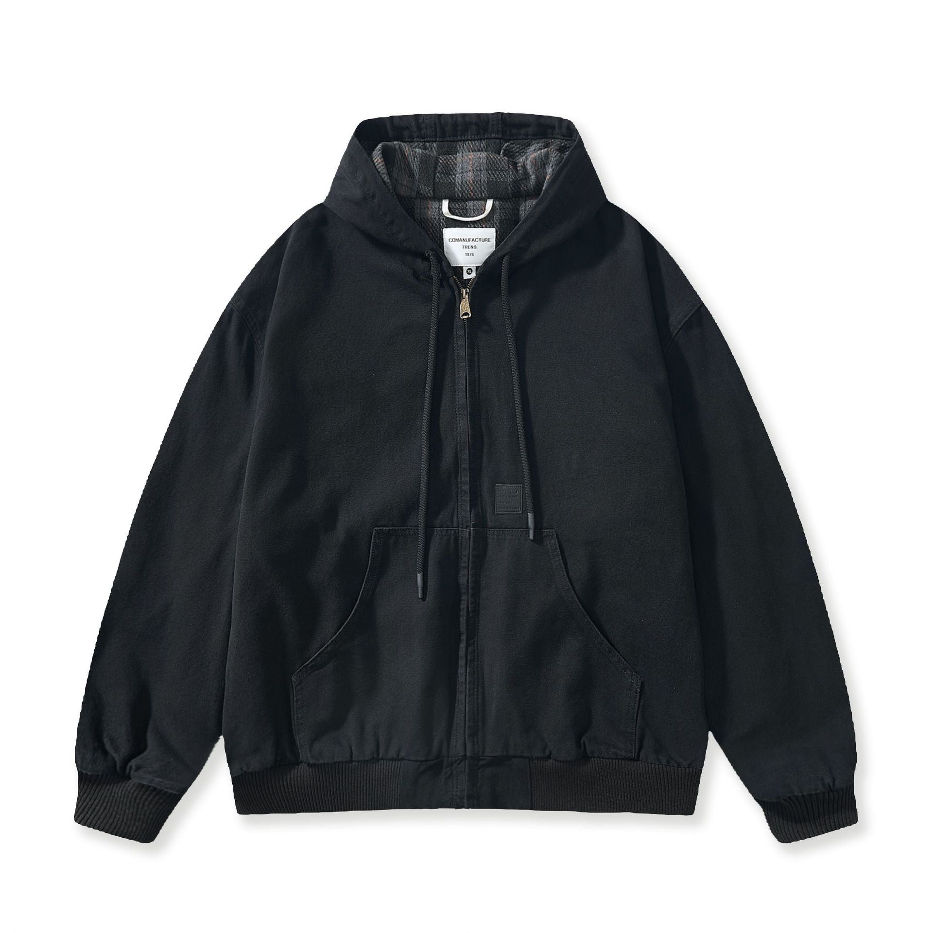 厚手コットンキャンバスをフェード加工でこなしたフーデッドワークジャケット。無骨な表地の内側にチェックフランネルを挟み、保温性とヴィンテージ感を両立しました。ラフに羽織れるゆったりシルエットとリブ使いの締めで、Tシャツからスウェットまで重ね着自在。ストイックなブラックと渋めブラウンの2色が、秋冬のストリートスタイルに深みを添えます。