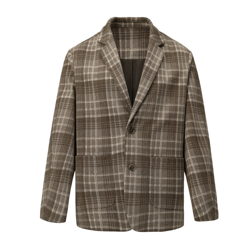 起毛ウール混素材で仕立てたブラウン×トープのチェックジャケット。肩パッドを省いたややワイドな身幅がリラックス感を生みつつ、仕立ての良さが際立つ端正なシルエットで、大人の装いに品格を添えます。 Tシャツやスウェットの上から羽織れば抜け感のあるカジュアルに、タートルニット×スラックスと合わせればオンスタイルにも対応。ニュートラルトーンの配色はブラックやグレーのボトムと相性抜群で、休日からビジネスカジュアルまで幅広く活躍する一着です。