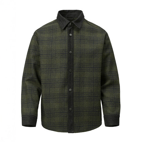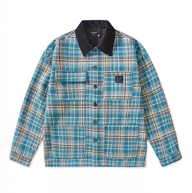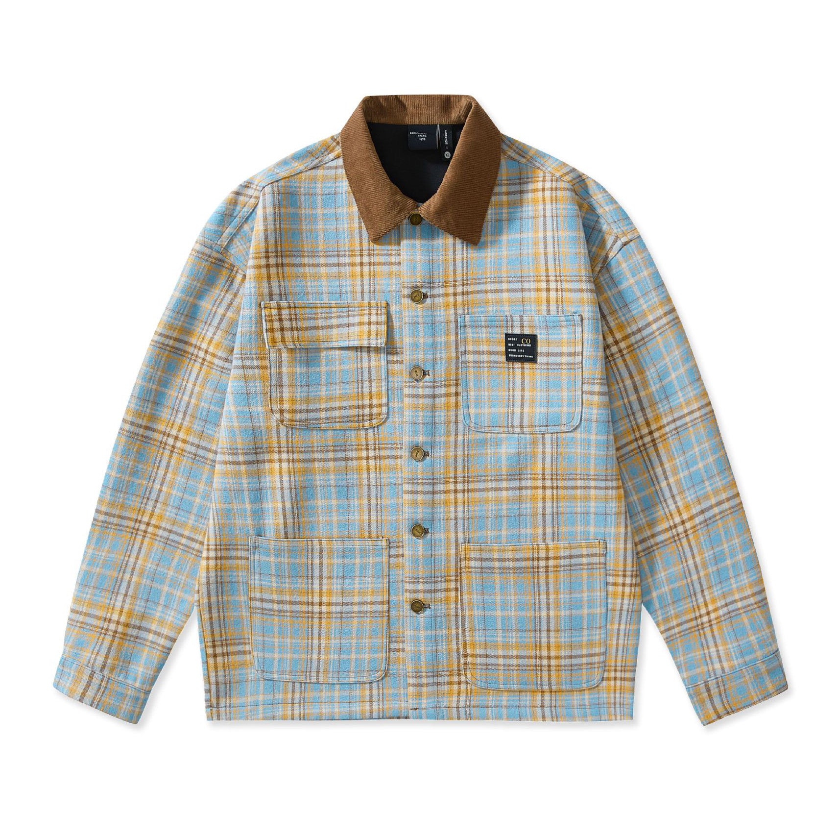 起毛感のあるマルチチェックをまとったカバーオール型ジャケット。ブラウンやブラックのコーデュロイ襟がヴィンテージワークの風格を添えつつ、胸と腰に配した大判ポケットが実用性を担保。肩を落としたボックスシルエットは厚手のスウェットやフーディを中に仕込んでももたつかず、大人のオフスタイルに程よい抜けを与えます。淡いブルー×キャメルとターコイズベースの2色展開で、いつものデニムやチノを即アップデートしてくれる一着です。