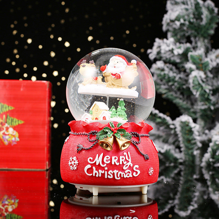 ガラスの球体の中でサンタが舞う雪に包まれるスノードームです。赤いギフトサック風の台座に「Merry Christmas」のロゴとゴールドベル、ヒイラギの飾りをあしらい、置くだけで一気に季節感。ライトを点けるとやさしい光が広がり、ナイトタイムのインテリアやツリーサイドをぐっと華やかにしてくれます。自分用はもちろん、ギフトにもぴったり。