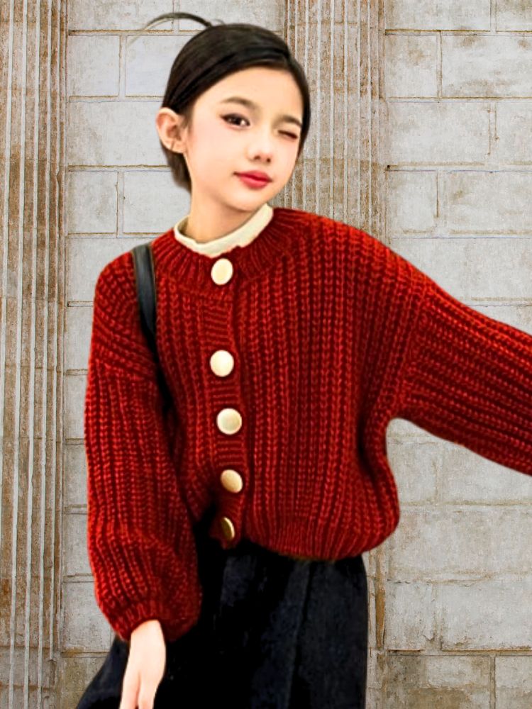 ざっくり編まれた立体感のあるデザインに、大きめのボタンをアクセントとしてプラス。