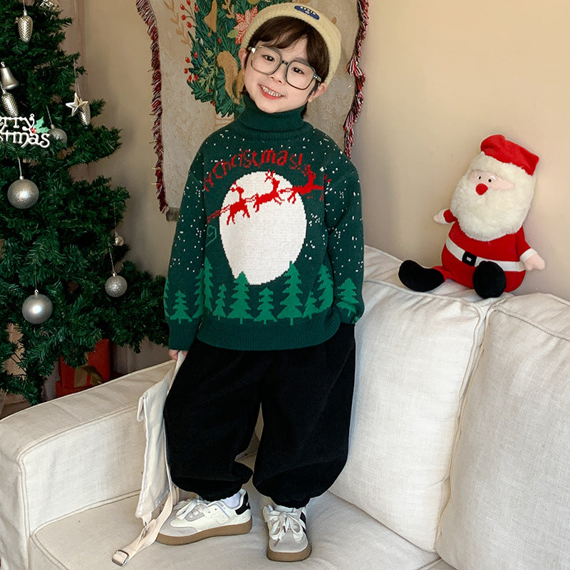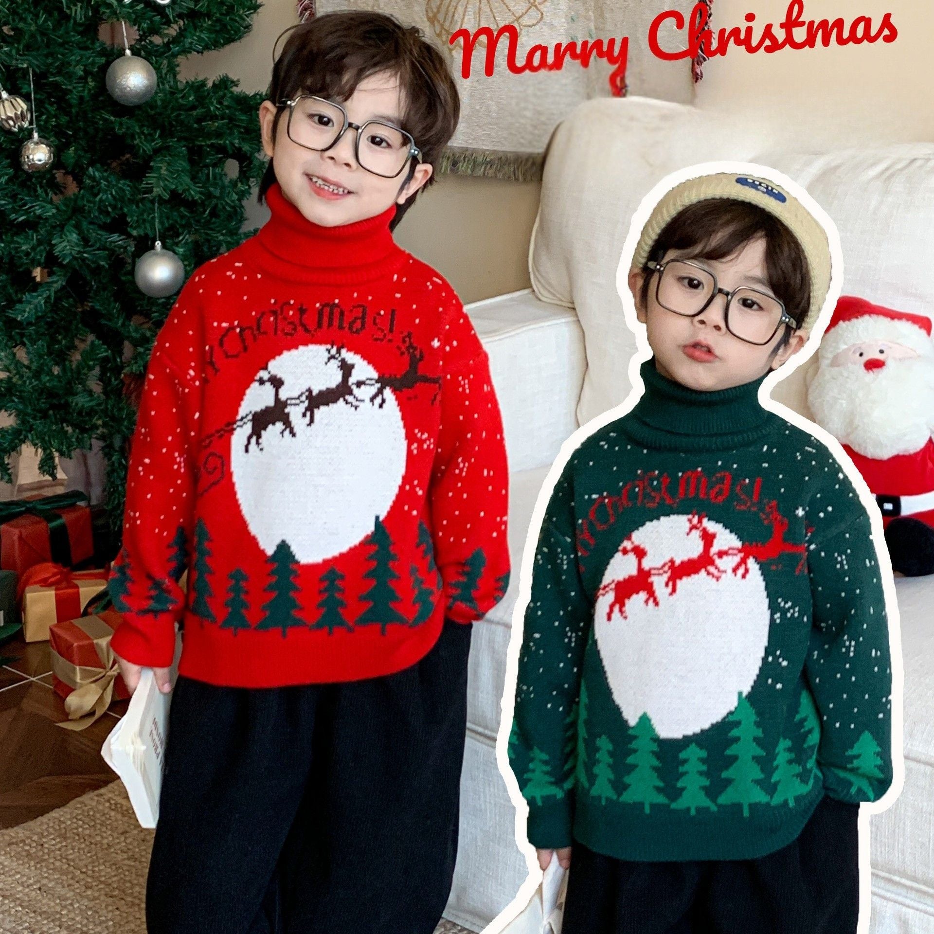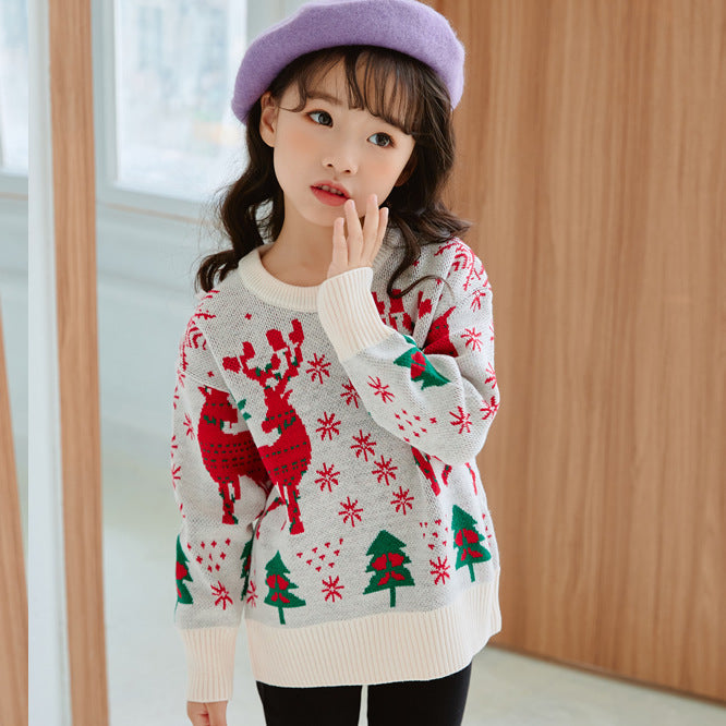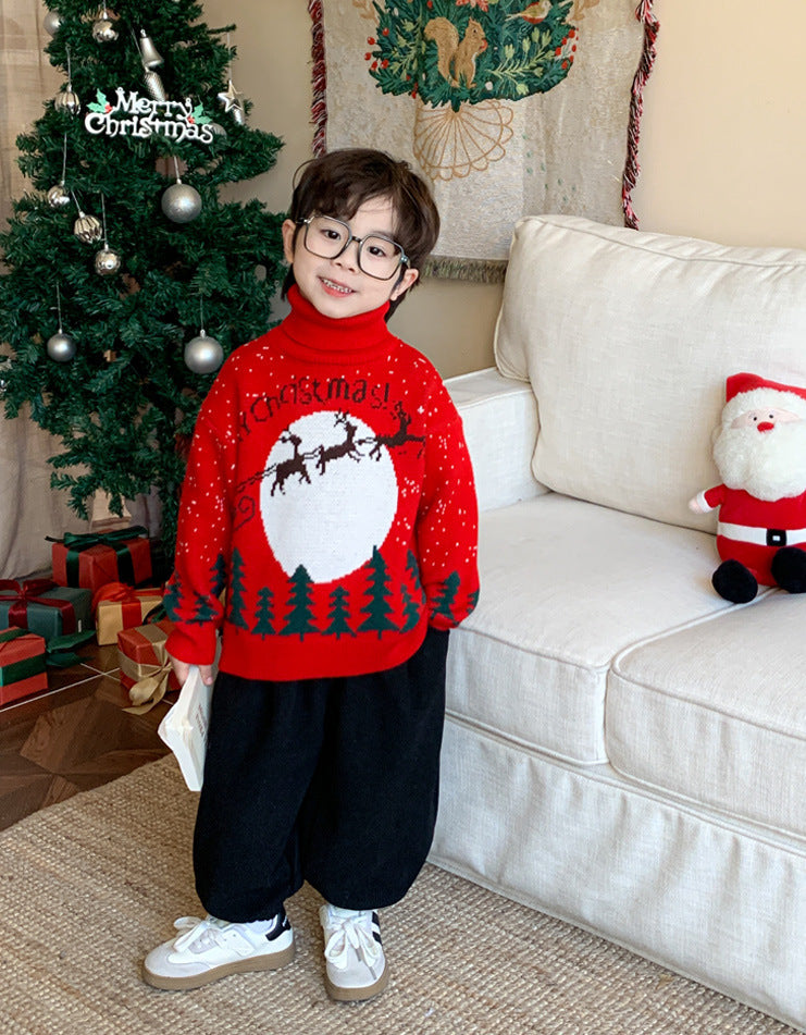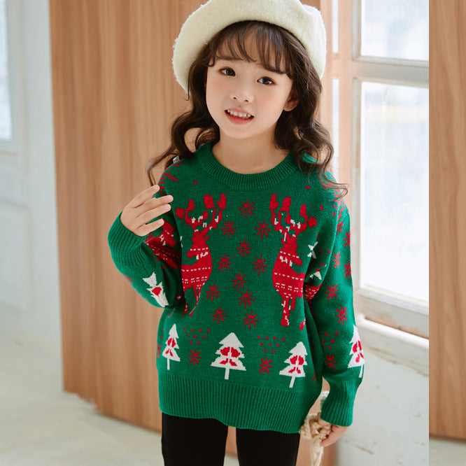 冬のイベントをもっと楽しく!トナカイとツリーがデザインされたキッズ用クリスマスセーター。