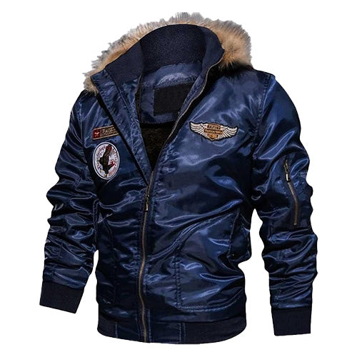 ボリューム感のある襟元のファーと、袖口や裾のリブが特徴的なボンバージャケットタイプ。