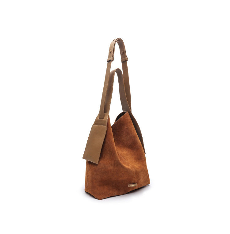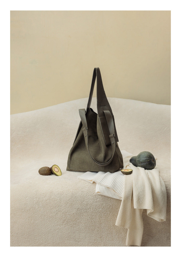 このトートは、やわらかな落ち感と構築的なフォルムのバランスを追求したデザイン。くったりと揺れるラインが、装いに“抜け感”を添えながらも、太めのストラップと直線的な輪郭が適度な引き締め役に。余計な装飾をそぎ落としたミニマルな佇まいだからこそ、どんなコーディネートにも自然と馴染みます。カラーはグリーン、ブラウンの2色展開です。