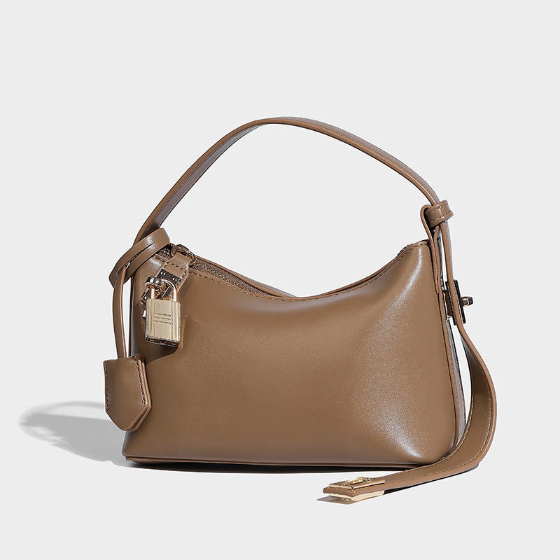 滑らかなレザー調に微艶をのせたミニショルダー。口元はファスナーで安心、ロックチャームが品よくアクセント。必要な荷物だけを軽やかに持てるサイズ感で、きれいめ通勤から週末カジュアルまで幅広くマッチします。カラーはブラウン、アプリコット、ホワイトの3色展開です。