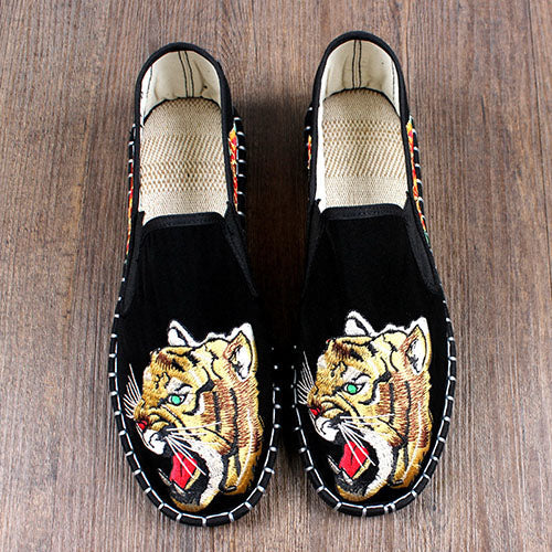 今にも「ガオー!」と雄叫びが聞こえてきそうな、迫力満点の虎刺繍が目を引く「タイガー刺繍スリッポン」。 サイドには華やかな牡丹の刺繍をあしらい、どの角度から見ても存在感抜群のデザインです。 軽やかな履き心地と柔軟なソールで、歩きやすさも快適。 ストリートファッションはもちろん、シンプルコーデのアクセントにもおすすめの一足です。