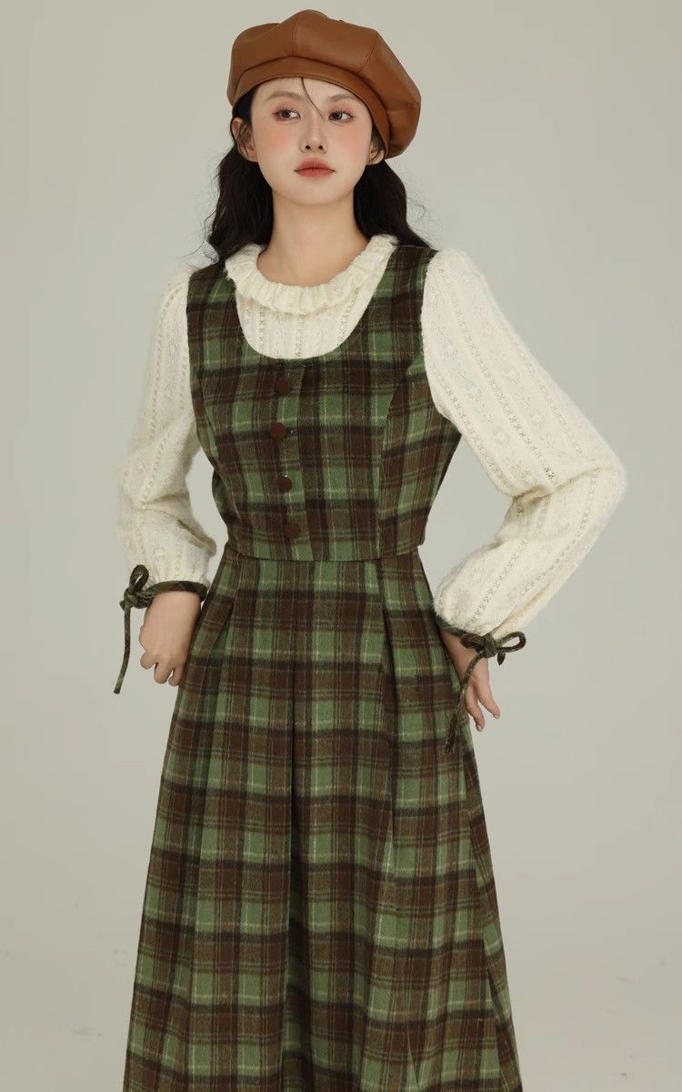 まるでブラウスとワンピースを重ねたように見えるフェイクツーピースデザイン。1枚でコーデが完成する手軽さと、きちんと感のある上品さを両立しました。クラシカルな大きめチェックが、秋冬らしい温もりと華やぎを添え、優しい風合いのニット袖が女性らしさを引き立てます。知的で上品、それでいて親しみやすい印象を叶える、大人女性のための一着です。