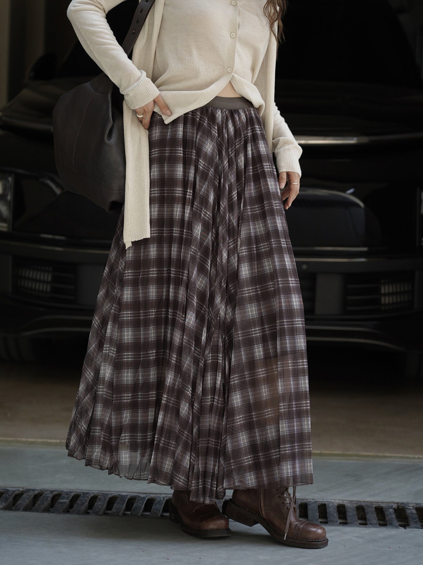 軽やかに揺れるシルエットが印象的な大きめチェックのスイングスカート。動くたびに表情を変える柔らかな生地感が、装いに上品な抜け感をプラスします。落ち着いたトーンのチェック柄は、甘すぎず大人らしい印象に。ニットやレザージャケットと合わせれば、季節感のある洗練スタイルが完成します。1枚でコーディネートを華やかに仕上げてくれる、秋冬の主役スカートです。