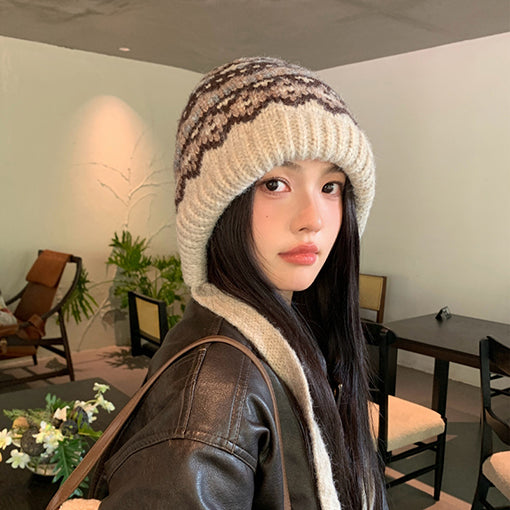 冬の定番柄、北欧風のノルディック柄。 ボリューム感のある編み地で、真寒さから頭と耳をしっかり守ります! 時々な冬のデニムスタイルから、レトロなワンピースまで、様々な秋冬ファッションにマッチする万能アイテム◎ ほっこりとした編み地と、優しい色合いを楽しんでください。