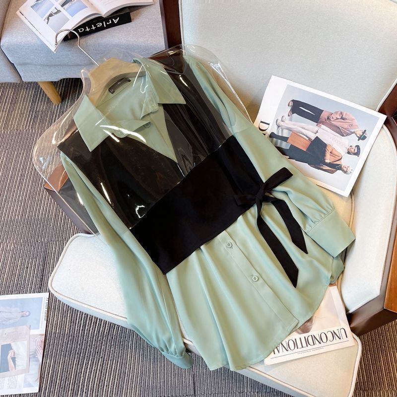 このモノトーン切替シャツが一発で解決します。鉄板である「モノトーンMIX」がデザインに組み込まれており、着るだけで120%洗練されたスタイルが完成する黄金律アイテム。柔らかなミントグリーンやピンクのサクラ色が、ブラックのVラインで引き締められ、あなたの顔まわりに**“くすみ知らず”の透明感を演出します。