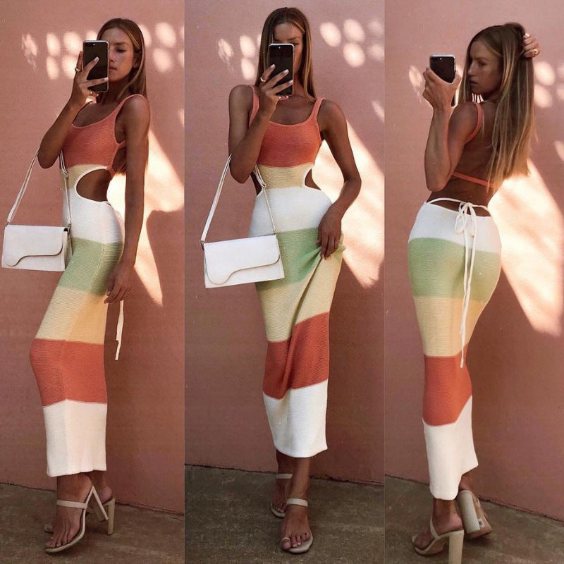 サマーニットのタイトな曲線美と、計算し尽くされたウェストのカットアウトが決め手。涼しげなカラーブロックが視覚的にウェストを絞り、着るだけでスタイルアップを叶える究極のサマードレス。リゾートやテラスで、自信のカーブを魅せて。