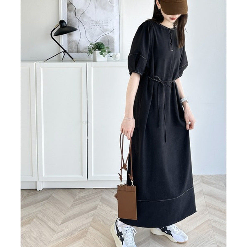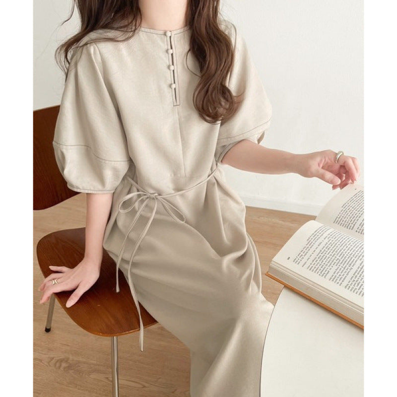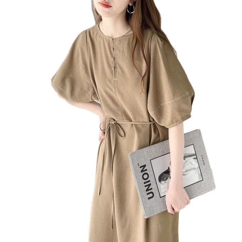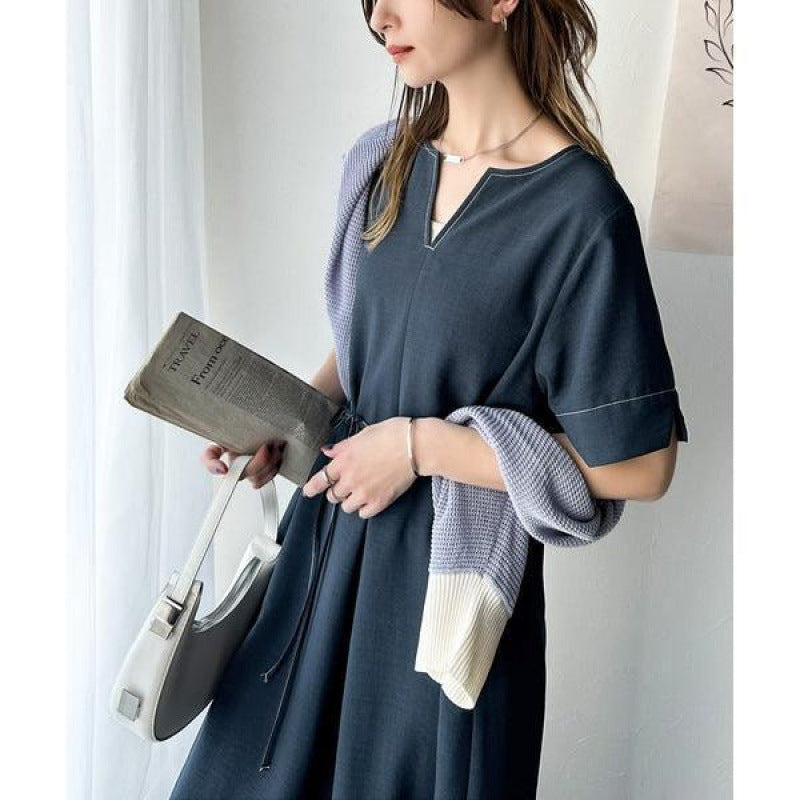 ゆったりとした落ち感のある袖が、気になる二の腕を自然にカバーしつつ、肩まわりをすっきり見せてくれます。前後2WAYデザインで、スクエアネック、ボタン付きのラウンドネックと、雰囲気を変えて楽しめるのも魅力。さらに腰紐を調節してウエストマークすれば、お好みのシルエットに仕上がります。