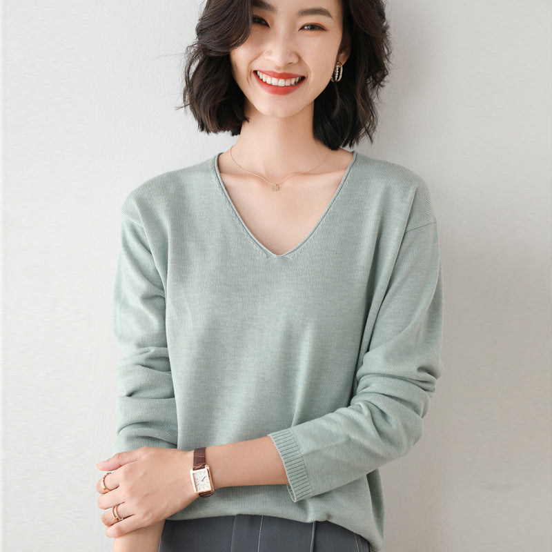 コートの下に着るニット素材は少しずつ薄手なものにシフトチェンジ。骨ストさんの得意なVネックで、デコルテを見せてスッキリとした印象を与えつつ、爽やかな春の訪れを感じさせます。