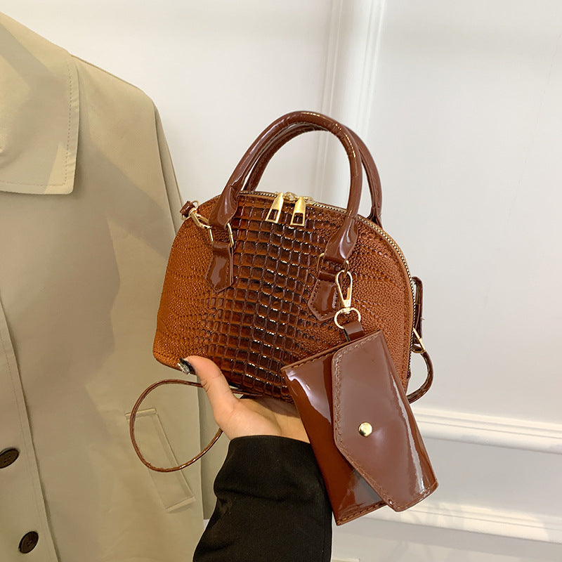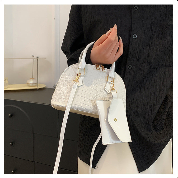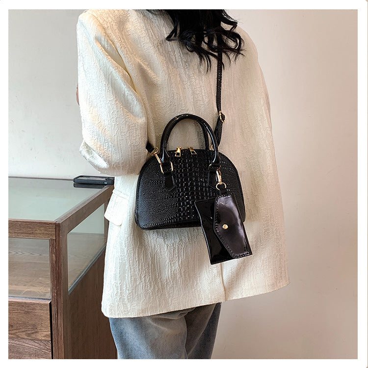 ちょっぴりレトロなクロコダイル柄バッグ。型押しだから主張しすぎず、どんなコーデにも合わせやすい。ツヤ感のあるコロンとした貝殻のような形もキュートです。取り外し可能なショルダーストラップとバッグチャームポーチ付きで、使いやすいのも嬉しいポイント。