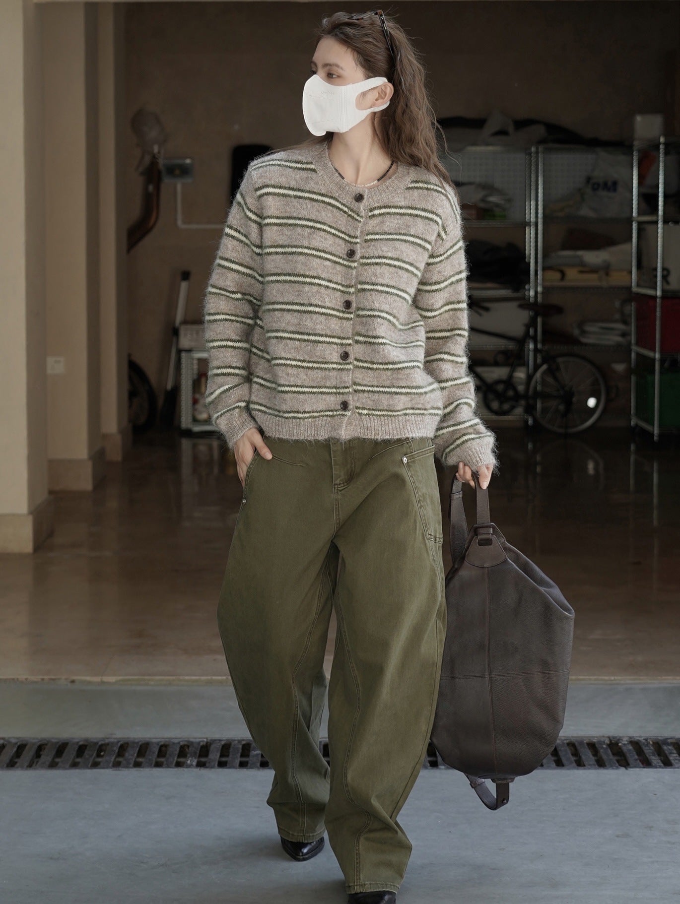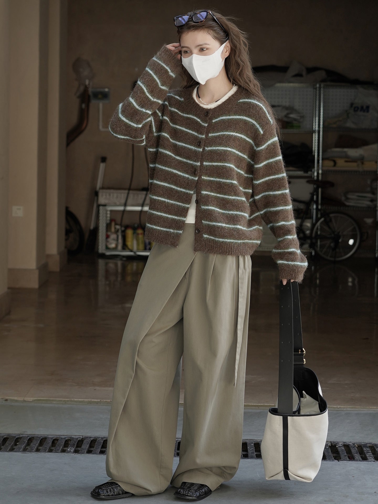 深みのあるブラウンに爽やかなミントボーダーを走らせた、冬の装いを軽やかにするカーディガン。