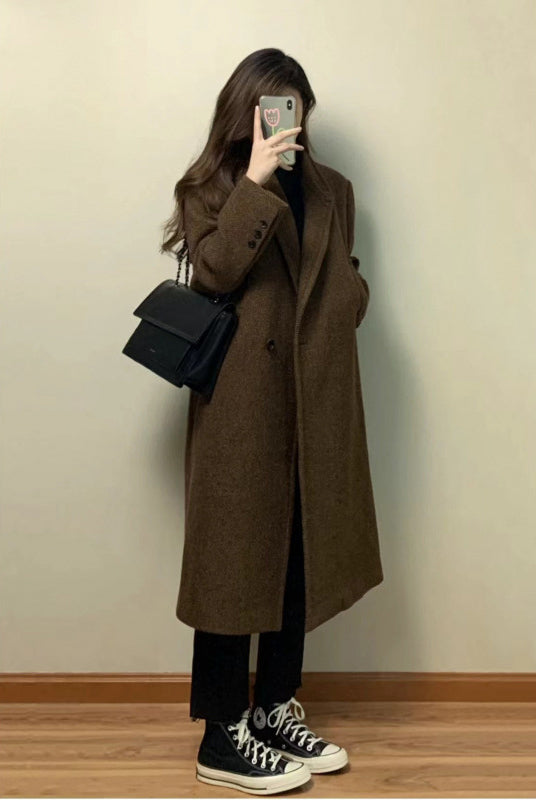 深みのあるモカブラウンが、冬の街に溶け込むロングコート。無駄のないシルエットとほどよい落ち感で、羽織るだけで上品な雰囲気になります。