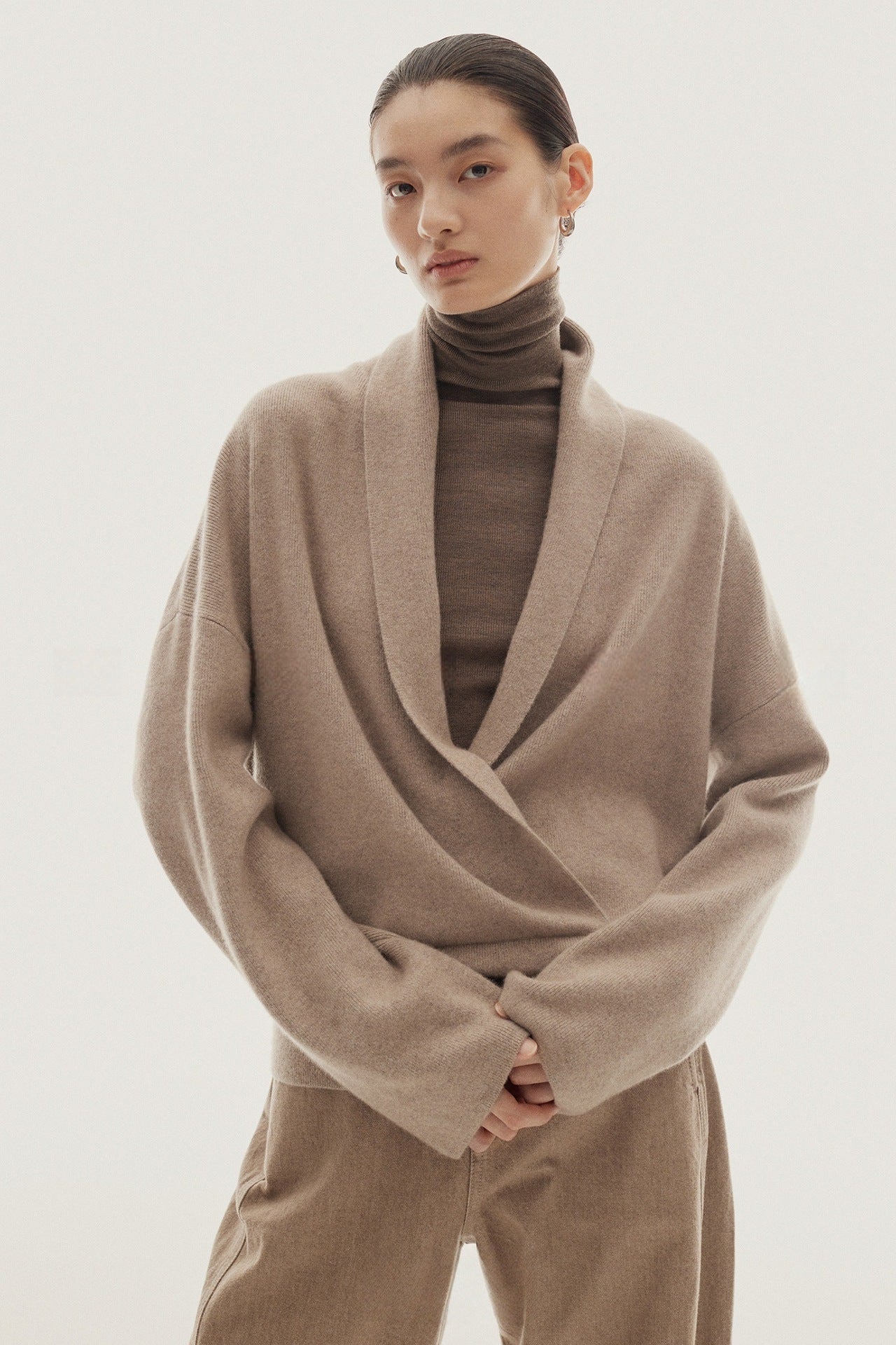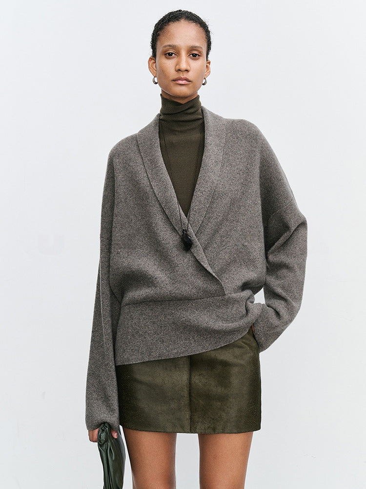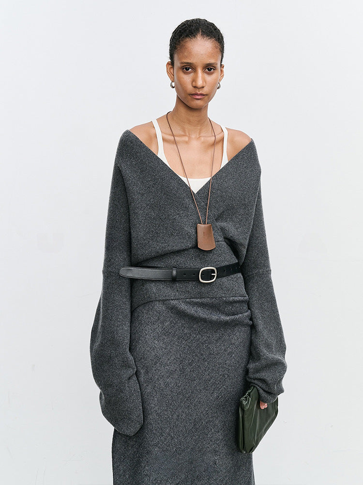 やわらかなトーンが印象的なドレープニット。深めのVラインが顔まわりをすっきり見せ、インナー次第で印象が変わる“レイヤード”スタイルを楽しめます。