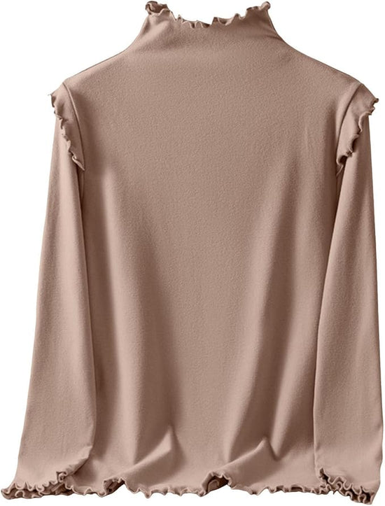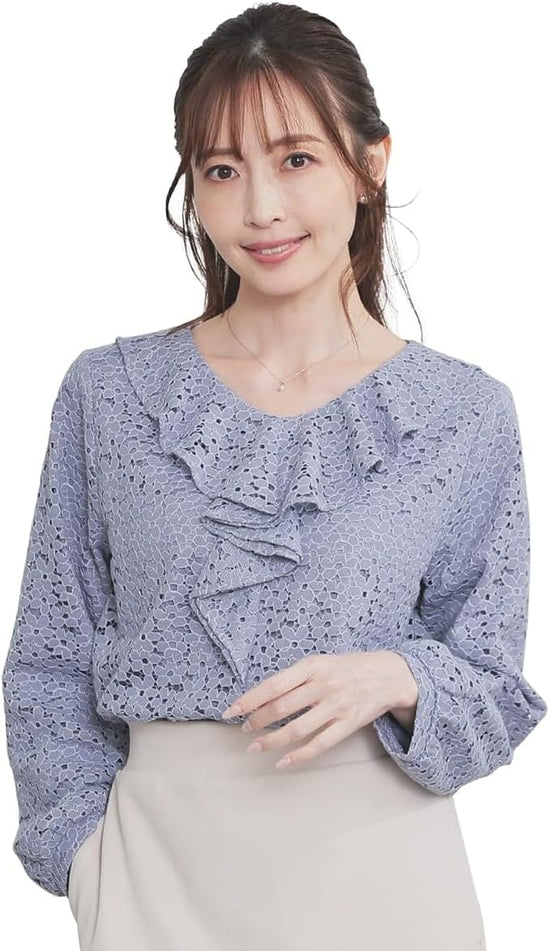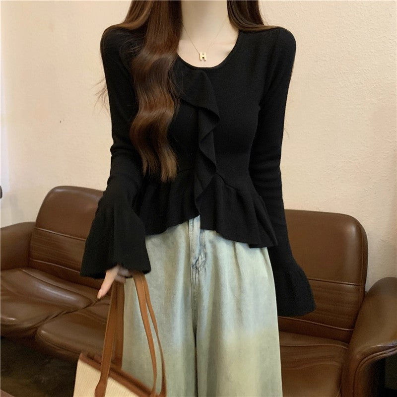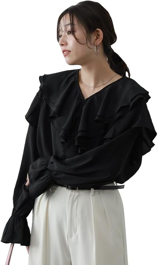 やわらかく揺れるラッフルが胸元とウエストを華やかに彩り、自然とラインを美しく見せるシルエット。 シンプルながら上品で女性らしい印象を与えるフェミニントップスです。 ほどよいフィット感でスタイルアップも叶い、1枚で“抜け感”と“こなれ感”を演出する秋冬のマストアイテム。