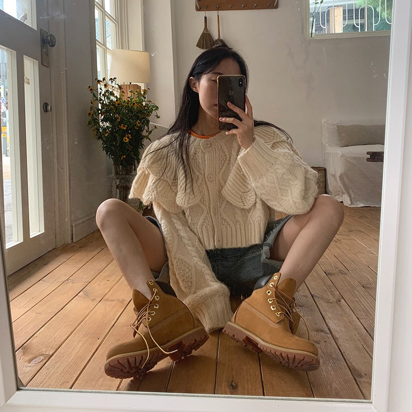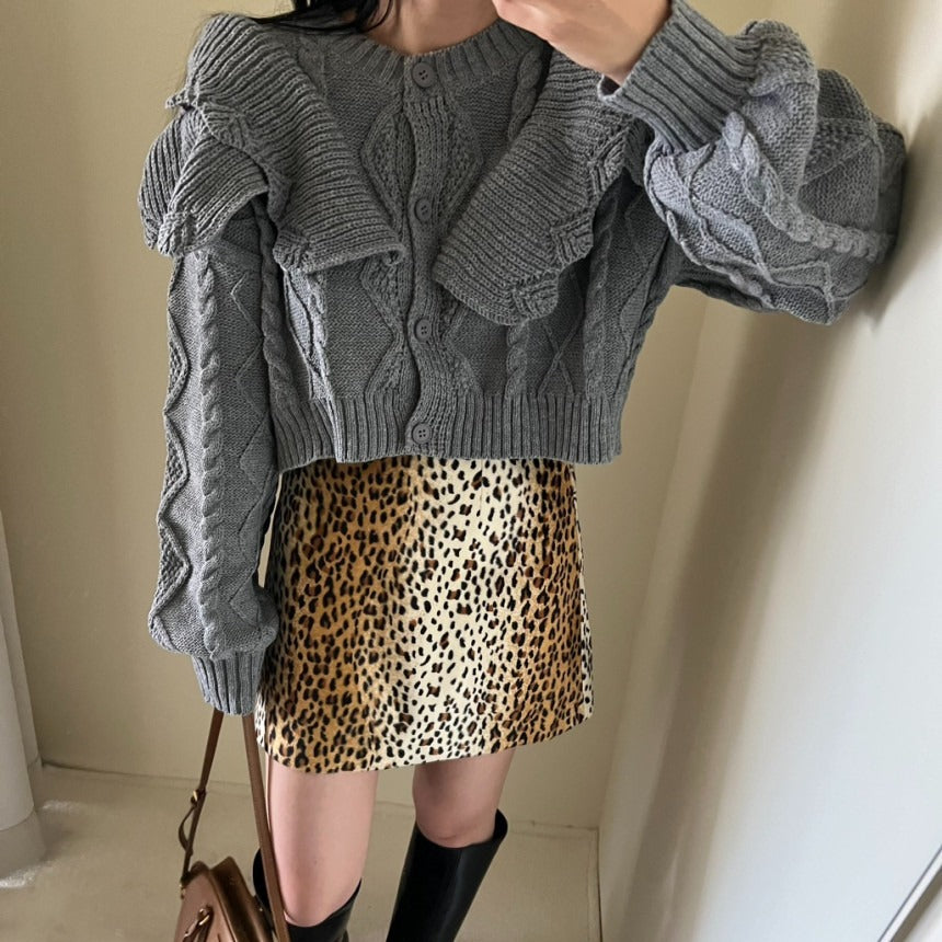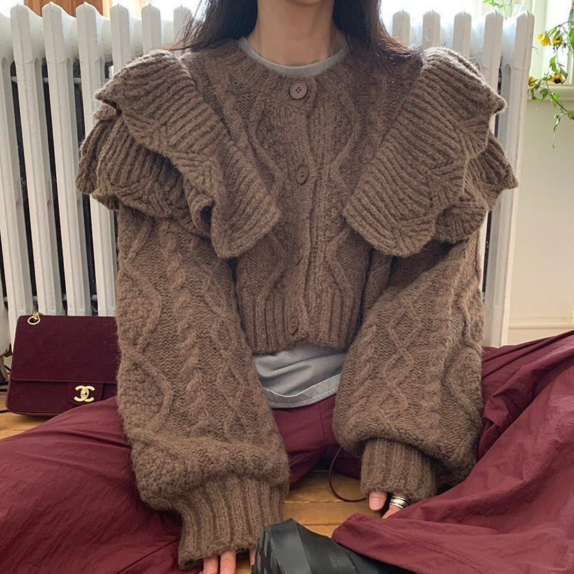 2段ラッフルが目を惹く、韓国ムード満点のショート丈ニットカーデ。 厚手で暖かく、ボリューム感のあるシルエットが華やか。 シンプルなボトムに合わせるだけで、旬の“カジュアルフェミニン”スタイルが完成します。