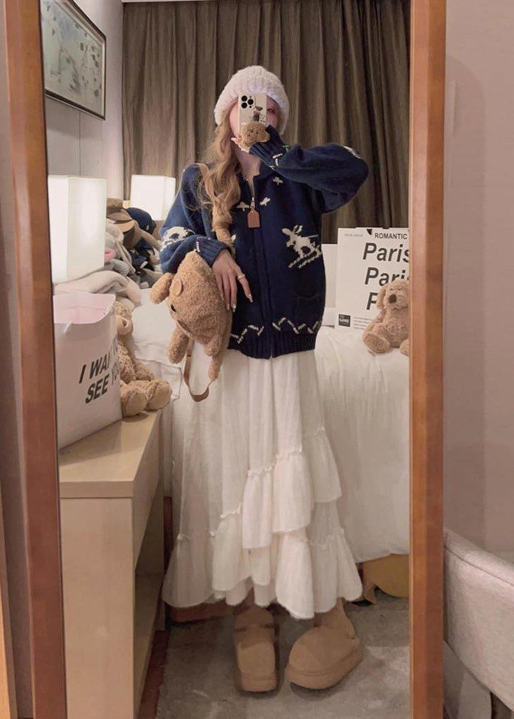 ふんわり広がる2段ラッフルと、異素材を組み合わせたパッチワークデザインが魅力。 裏起毛素材で見た目以上にあたたかく、寒い日も快適に過ごせます。 動くたびに揺れるシルエットが軽やかで、ニットやスウェットとも好相性。 冬のおでかけコーデを華やかに彩る主役級スカートです。