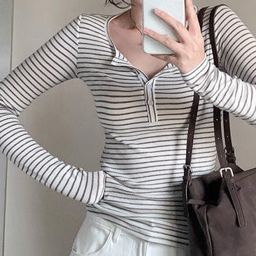 薄手の長袖トップス。体にフィットして、ボディラインを美しく見せてくれます。今の時期ベースに着れば、見せてもOKなレイヤードファッションの完成です。色々なアウターとの組み合わせを楽しんで。