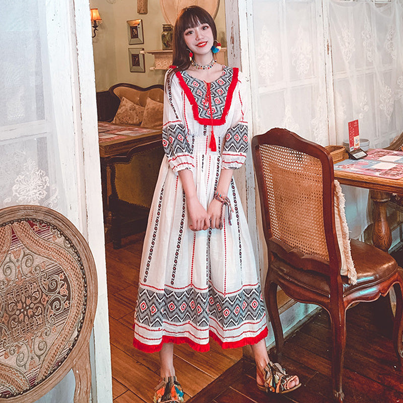 胸元や袖、裾に施された独特のプリントと、赤いフリンジやタッセルがアクセントになっています。