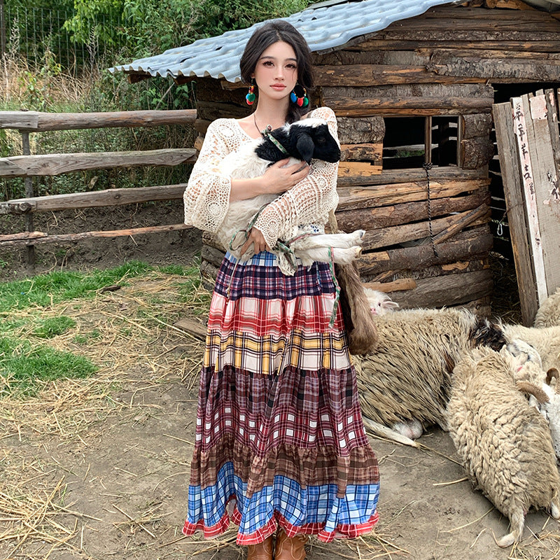 数種類のチェック柄をつなぎ合わせた、エスニックテイストのパッチワーク風スカート。