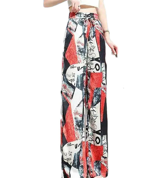 現代的な幾何学柄が印象的なトップスとパンツのセットアップ。