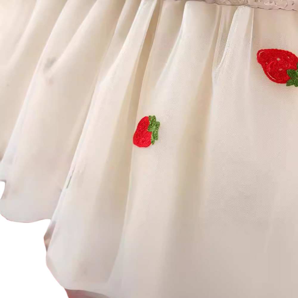 かわいいいちご柄チュールワンピースです。上身頃は柔らかいコットン素材、スカート部分は透け感のあるチュールにいちご刺繍入り。