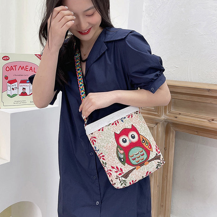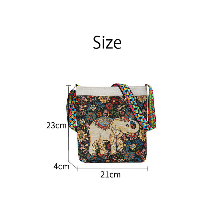 - 象モチーフと花柄が織り込まれた、エスニック調のジャガードショルダーバッグ。
