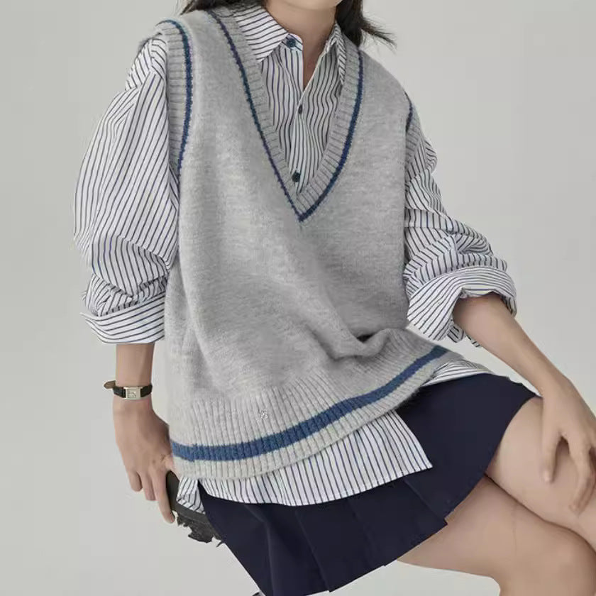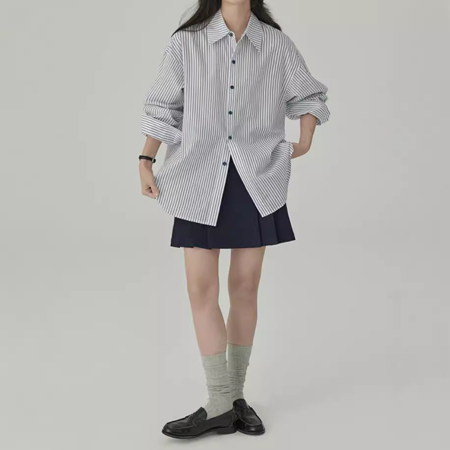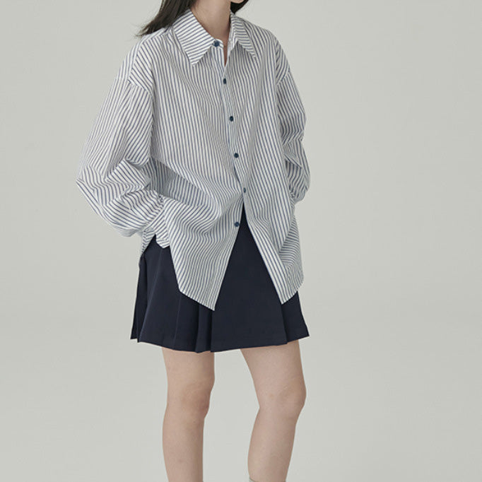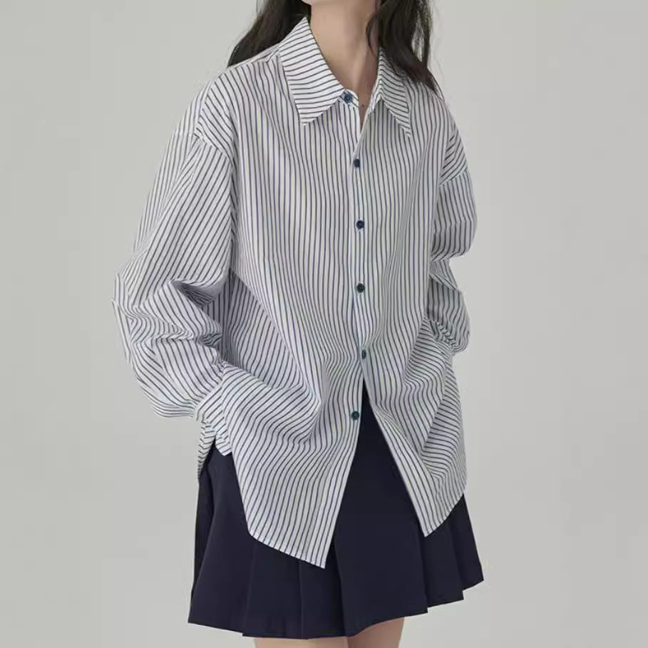 - 繊細ピンストライプに深いブルーボタンが全体をきゅっと引き締める。