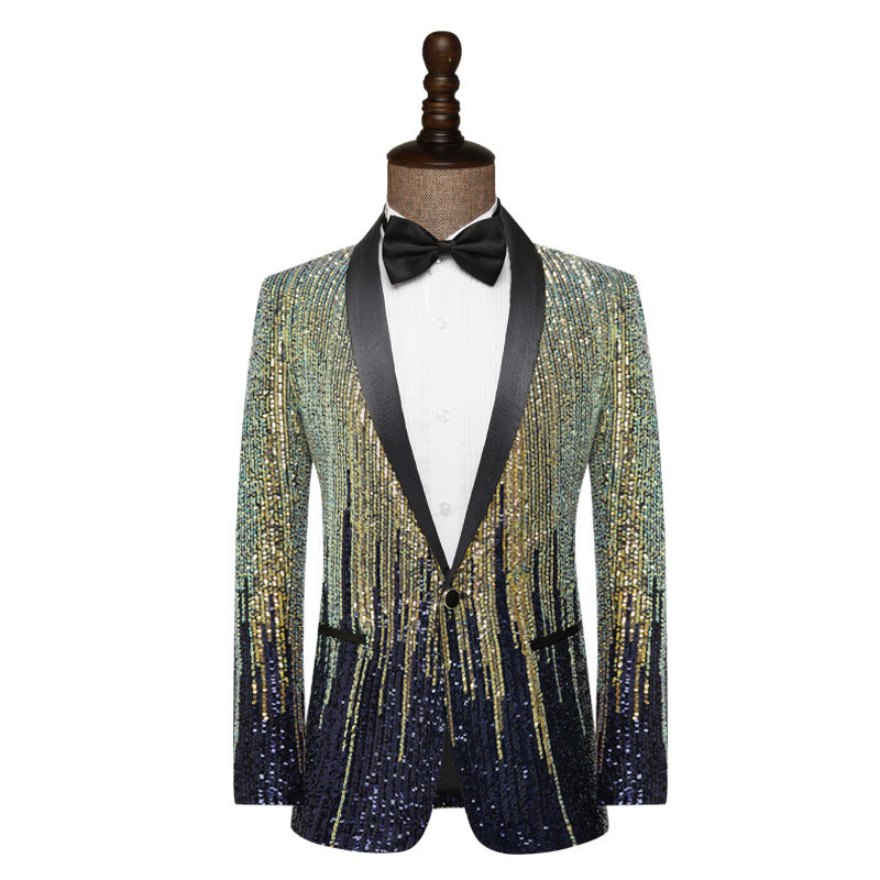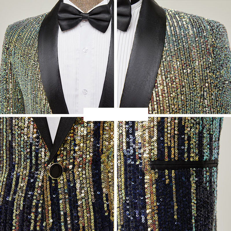 - ゴールドとブルーのスパンコールが芸術的なパーティーナイトスーツ。