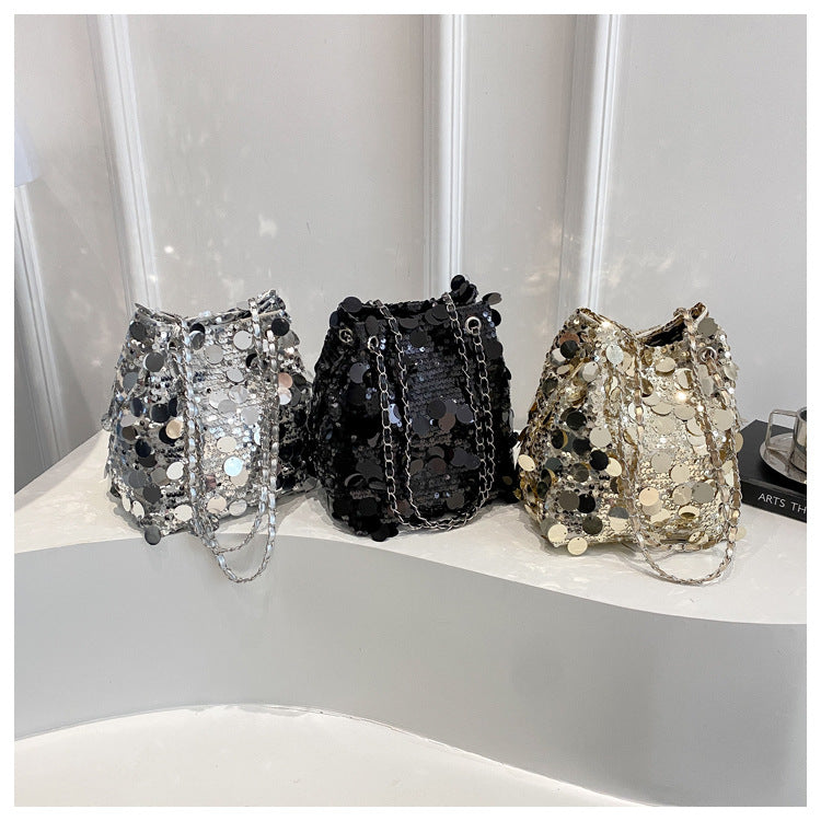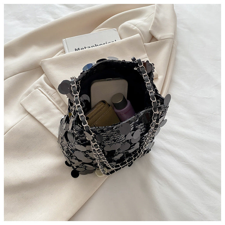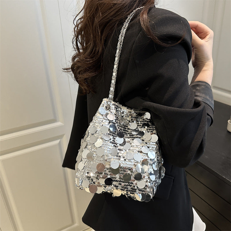 大小様々なスパンコールが、光を反射して華やかに煌めくトートバッグ。シルバーとゴールドの2色展開で、どちらも存在感のある輝きを放ちます。いつものコーディネートにプラスするだけで、一気に華やかさを演出。パーティーはもちろん、お食事会やデートなど、少し特別な日のお出かけに最適です。長めのチェーンストラップで肩掛けもでき、持ち運びやすさも魅力。シンプルなドレスにも映える主役級のアイテムです。