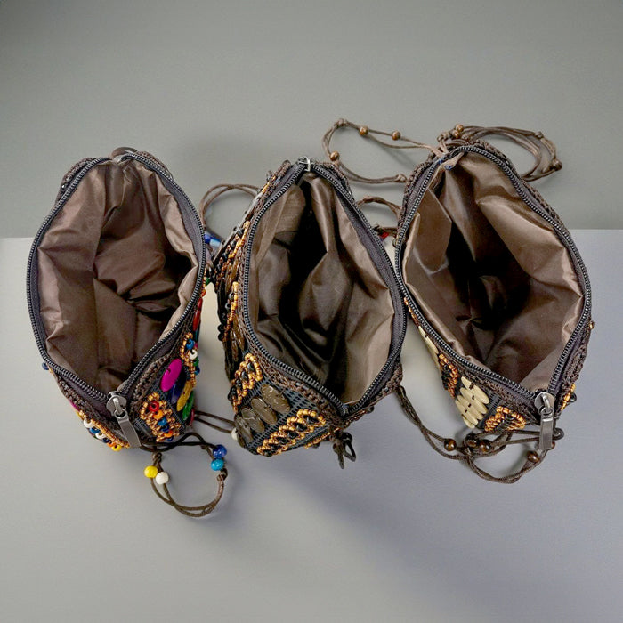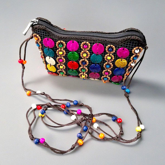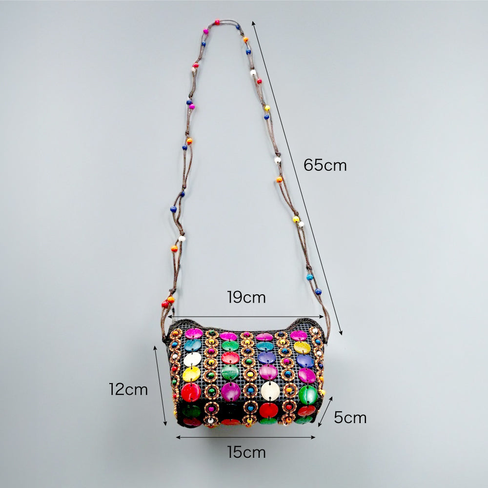- カラフルなウッドビーズとココナッツシェルを組み合わせた、ハンドメイドのモザイクバッグ。