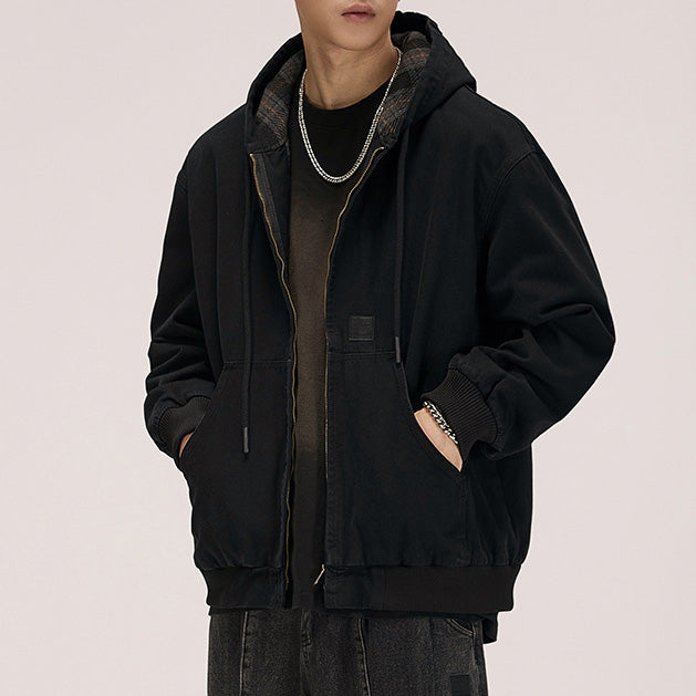 - 裏地に忍ばせたチェック柄ライニングがさりげないアクセント。メタルジップと大きなカンガルーポケットで実用性もしっかり確保。