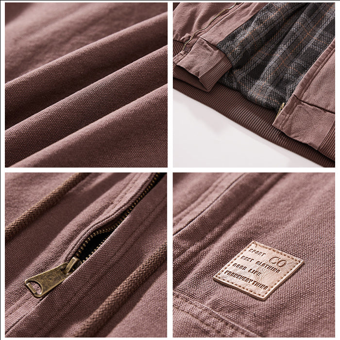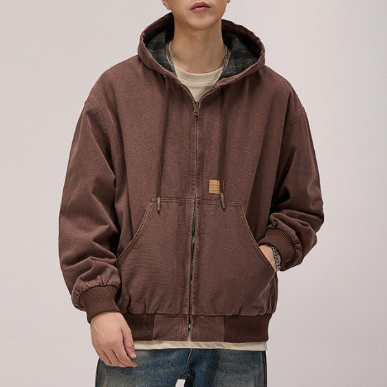 - ヘヴィーコットンキャンバスをフェード加工で味出ししたフーデッドワークジャケット。ドロップショルダーとリブ裾のバルーンシルエットが大人の抜け感を演出。