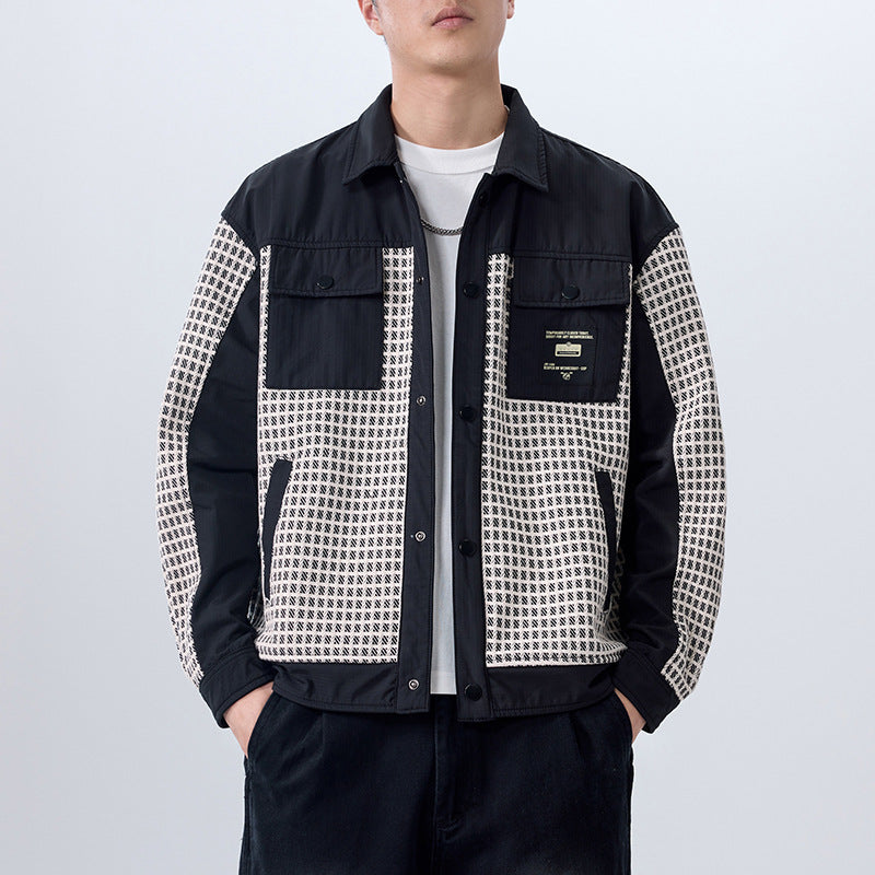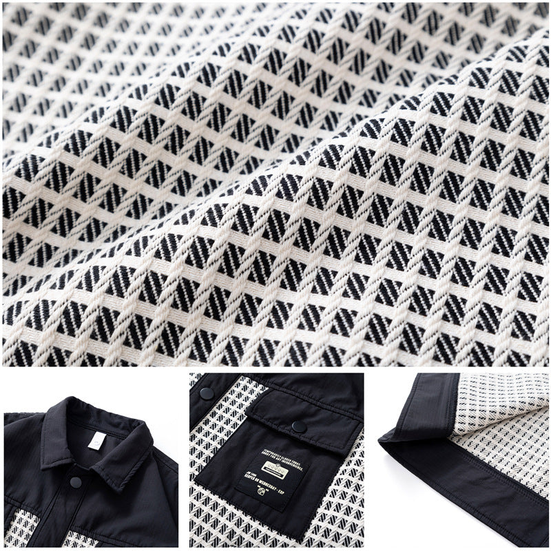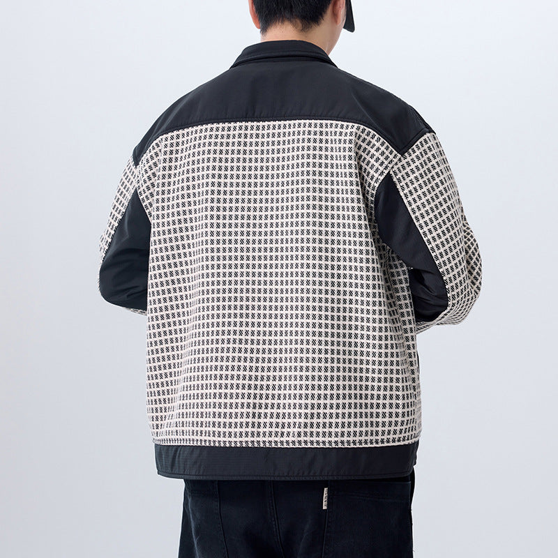 - モノトーンのマイクロチェックと無地ブラックを切り替えたブロッキングデザイン。胸フラップ&脇ポケットは無地で縁取り、メリハリの効いたモダンワークスタイルに。