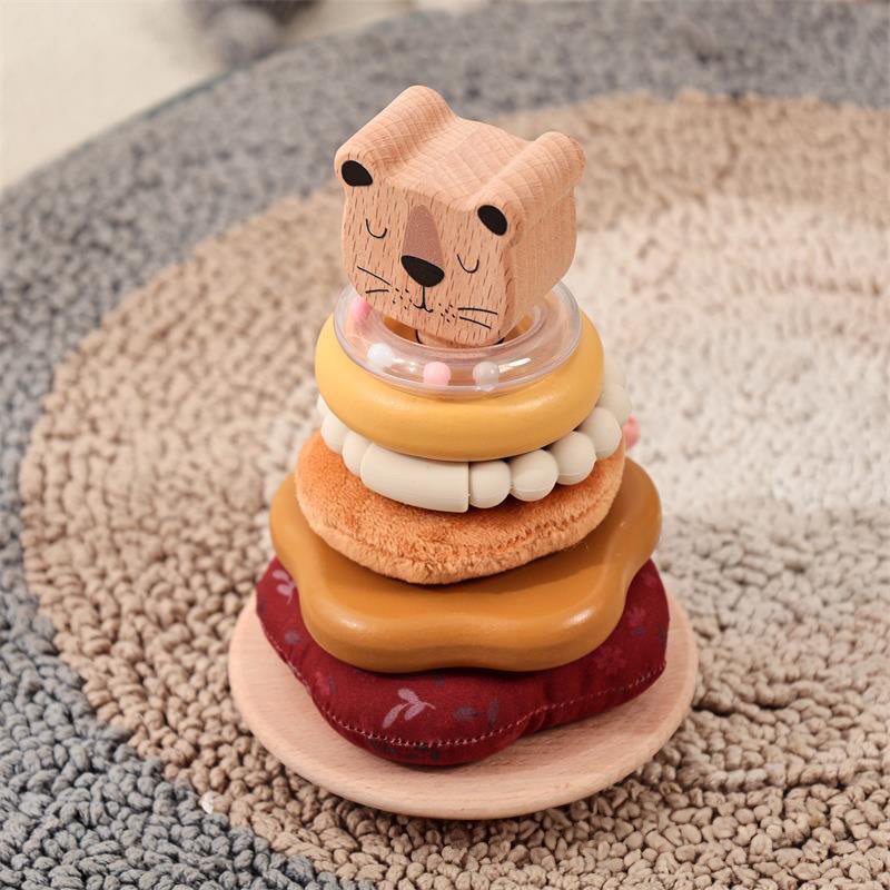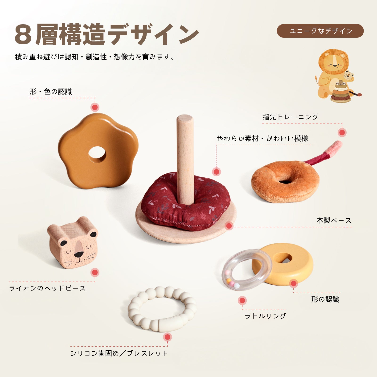• 木・布・シリコン・ラトルの異素材リングで、手ざわりと音の違いを発見。