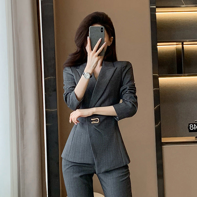 デザイン: テーラードカラー、長袖のレギュラースリーブで、アシンメトリーな前立てとゴールドのバックルがモダンなアクセントになっています。