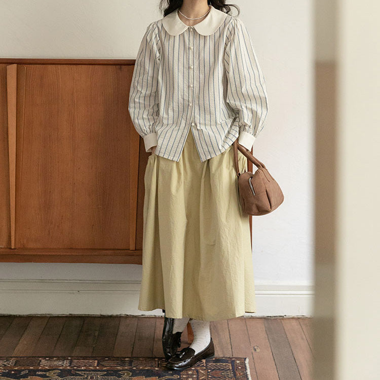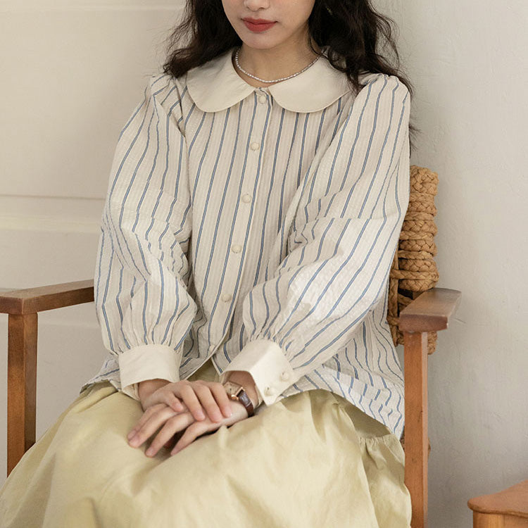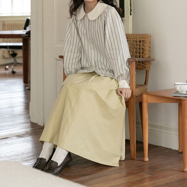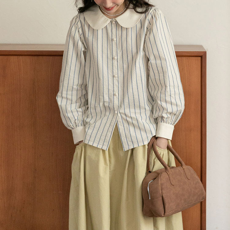 - 丸襟×パール調ボタンで上品な可憐さ、体の線を拾いにくいシルエット。