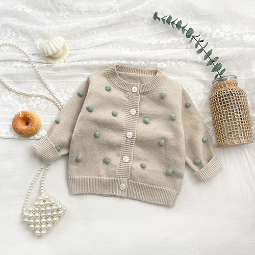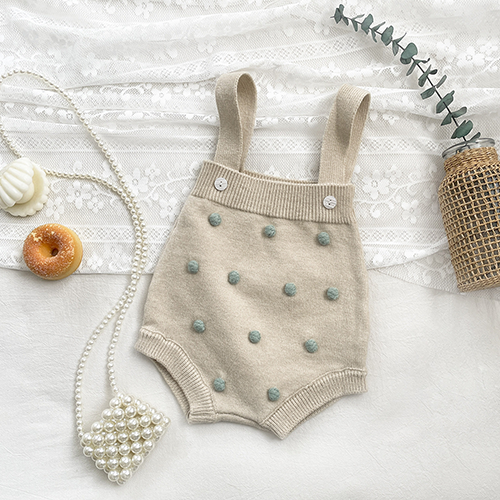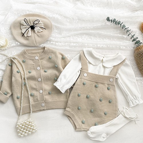 - 水玉のポンポン刺繍がかわいいナチュラルカラーのロンパース/カーディガン◎