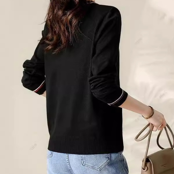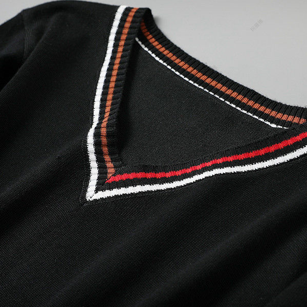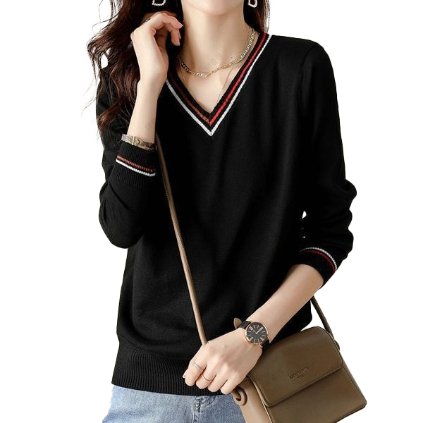 深みのあるブラックに、シャープなVネックラインが映えるデザインは、 ブルベ冬の方の透明感と相性抜群。ネックと袖にあしらわれた赤×白のラインが、クールな印象の中に程よいアクセントをプラス。シンプルながらも存在感のある一枚で、都会的でモードな着こなしを楽しんで。