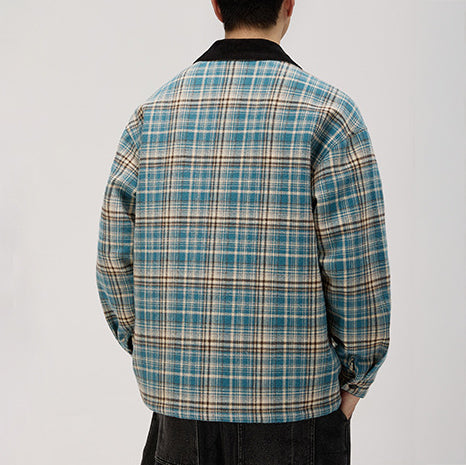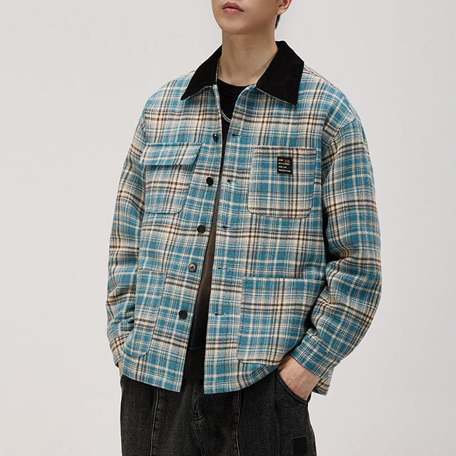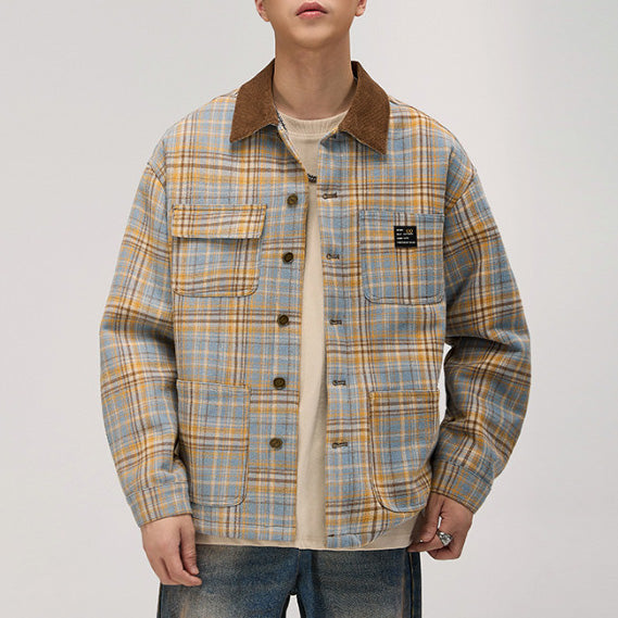 - 淡いブルーやキャメルを重ねた明るめチェックが旬。コーデュロイ襟のコントラストがワーク感を引き締め、大人の遊び心を演出。