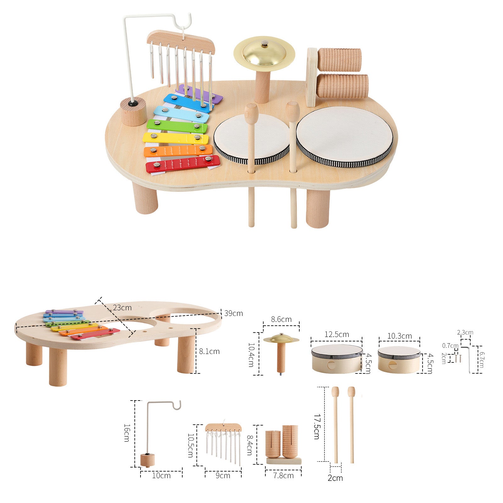 ドラム・木琴・シンバル・チャイム・ギロの5楽器を一台に。